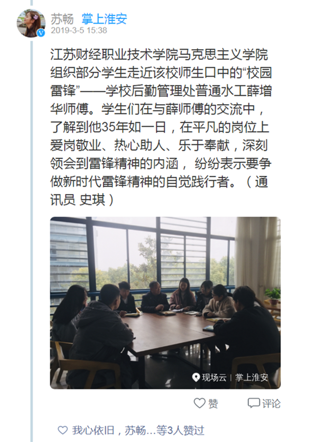 江苏财经职业技术学院马克思主义学院组织部分学生走近该校师生口中的“校园雷锋”——学校后勤管理处普通水工薛增华师傅。学生们在与薛师傅的交流中,了解到他35年如一日,在平凡的岗位上爱岗敬业、热心助人、乐于奉献,深刻领会到雷锋精神的内涵, 纷纷表示要争做新时代雷锋精神的自觉践行者。(通讯员 史琪)
