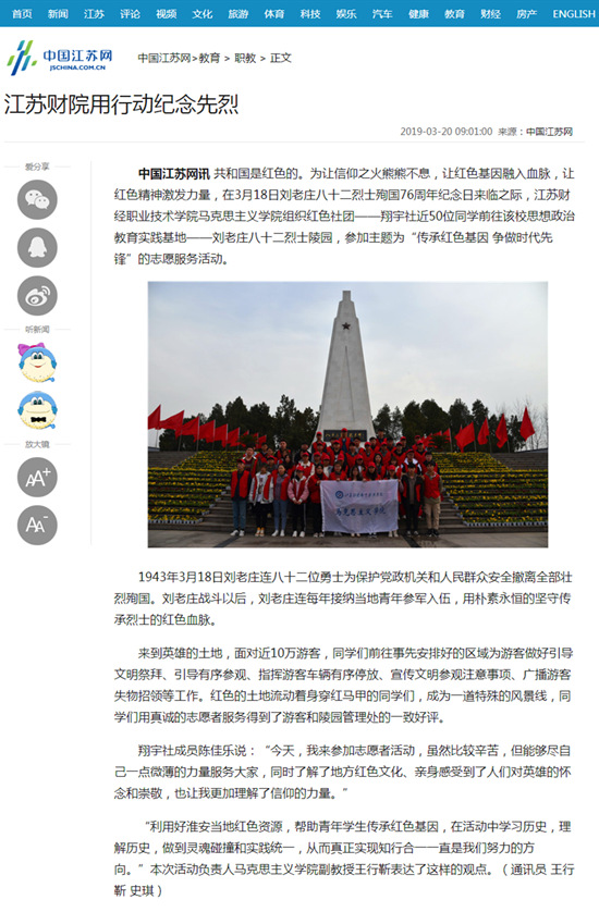 共和国是红色的。3月18日是刘老庄八十二烈士殉国76周年纪念日,为让信仰之火熊熊不息,让红色基因融入血脉,让红色精神激发力量,当天,江苏财经职业技术学院马克思主义学院组织红色社团——翔宇社近50位同学前往该校思想政治教育实践基地——刘老庄八十二烈士陵园,参加主题为“传承红色基因 争做时代先锋”的志愿服务活动。