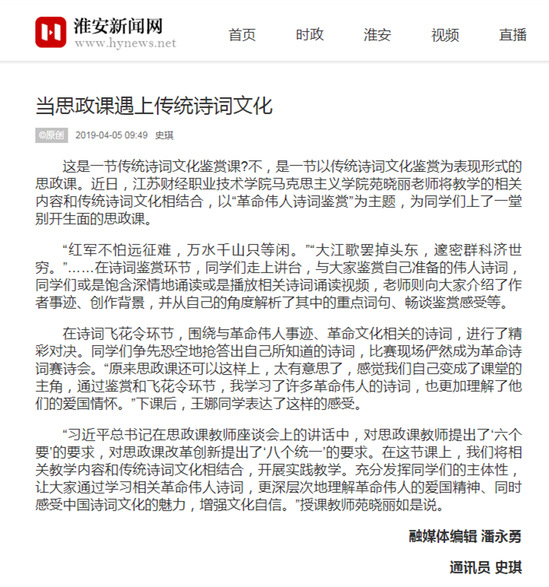 这是一节传统诗词文化鉴赏课?不,是一节以传统诗词文化鉴赏为表现形式的思政课。近日,江苏财经职业技术学院马克思主义学院苑晓丽老师将教学的相关内容和传统诗词文化相结合,以“革命伟人诗词鉴赏”为主题,为同学们上了一堂别开生面的思政课。