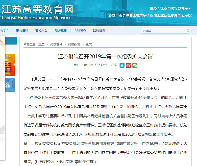 1月10日下午,江苏财经职业技术学院召开纪委扩大会议,校纪委委员、各党总支(直属党支部)纪检委员及纪委办工作人员参加了会议。会议由校党委委员、纪委书记王传荣主持。