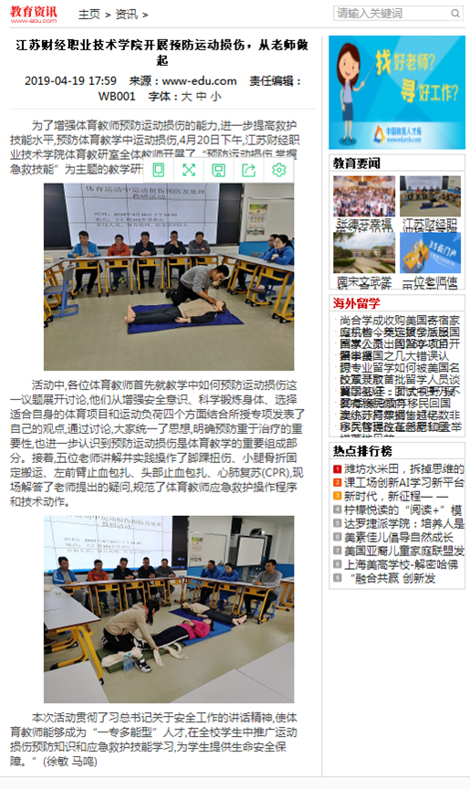(通讯员 徐敏 马鸣)为了增强体育教师预防运动损伤的能力,进一步提高救护技能水平,预防体育教学中运动损伤,4月20日下午,江苏财经职业技术学院体育教研室全体教师开展了“预防运动损伤,掌握急救技能”为主题的教学研讨活动。