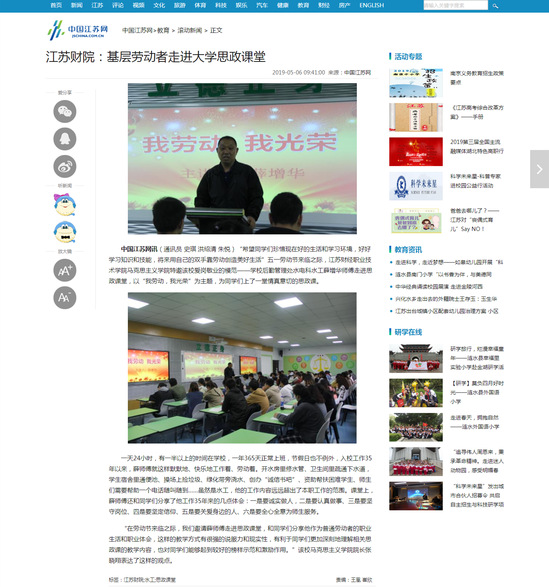 (通讯员:洪绍青 史琪 朱悦)“希望同学们珍惜现在好的生活和学习环境,好好学习知识和技能,将来用自己的双手靠劳动创造美好生活”五一劳动节来临之际,江苏财经职业技术学院马克思主义学院特邀该校爱岗敬业的模范——学校后勤管理处水电科水工薛增华师傅走进思政课堂,以“我劳动,我光荣”为主题,为同学们上了一堂情真意切的思政课。