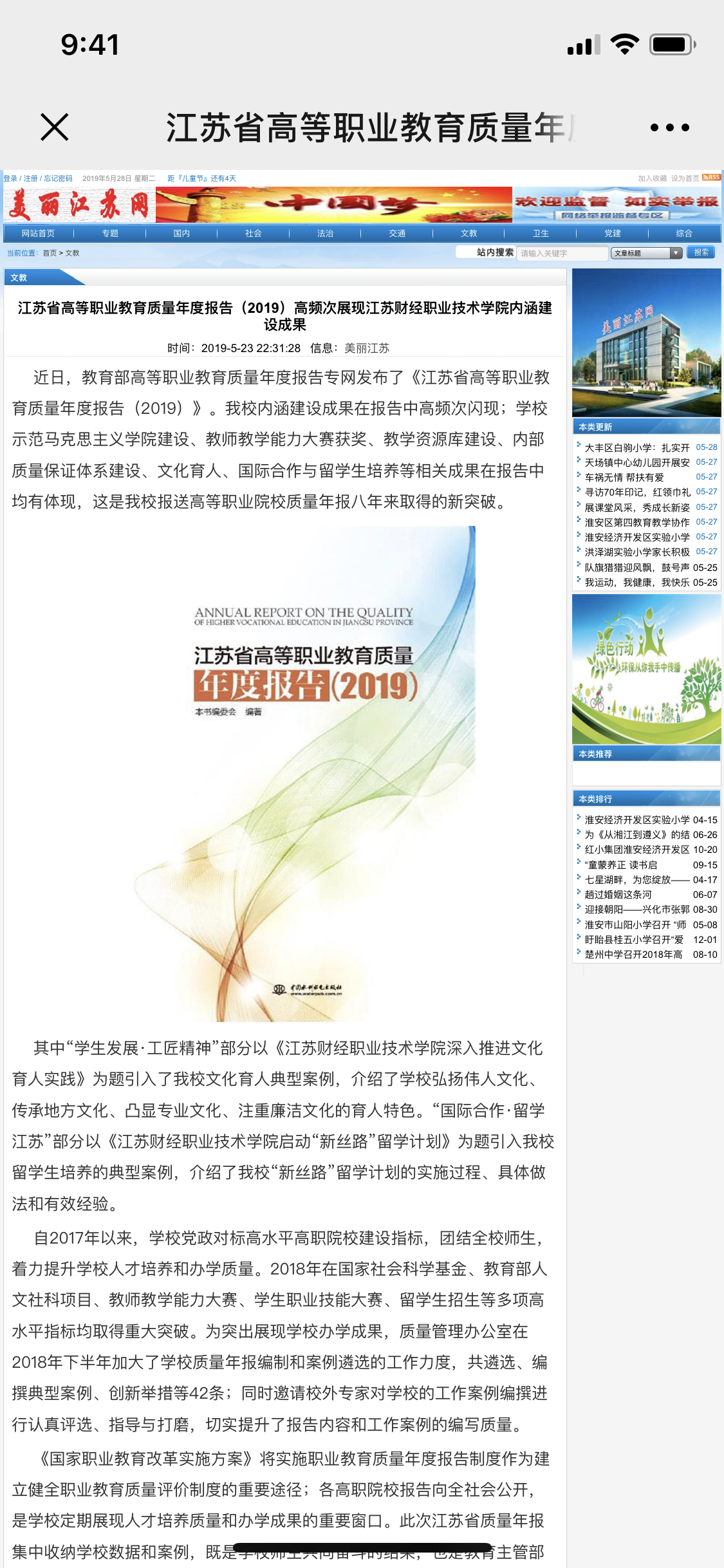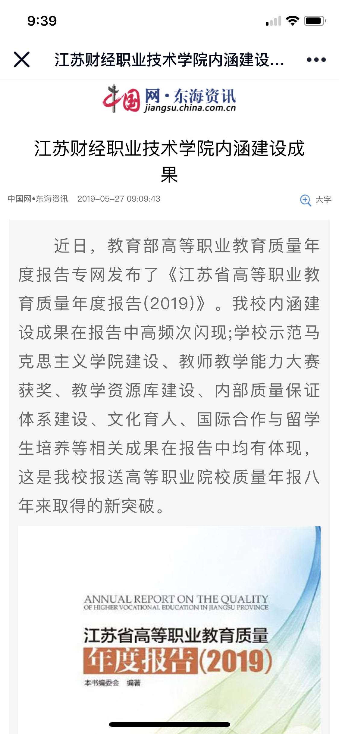 近日,教育部高等职业教育质量年度报告专网发布了《江苏省高等职业教育质量年度报告(2019)》。我校内涵建设成果在报告中高频次闪现;学校示范马克思主义学院建设、教师教学能力大赛获奖、教学资源库建设、内部质量保证体系建设、文化育人、国际合作与留学生培养等相关成果在报告中均有体现,这是我校报送高等职业院校质量年报八年来取得的新突破。