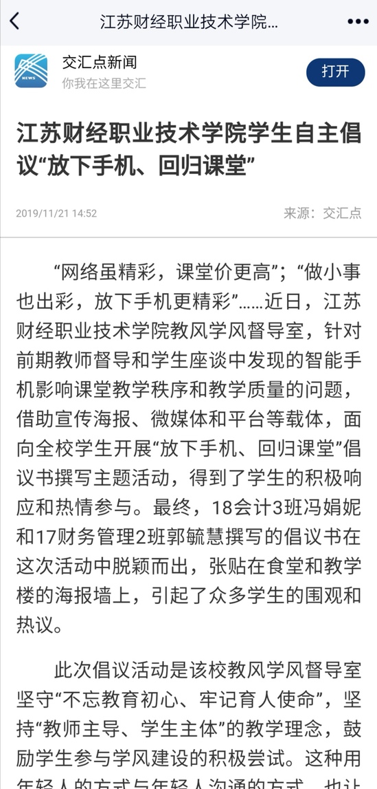 “网络虽精彩,课堂价更高”;“做小事也出彩,放下手机更精彩”……近日,江苏财经职业技术学院教风学风督导室,针对前期教师督导和学生座谈中发现的智能手机影响课堂教学秩序和教学质量的问题,借助宣传海报、微媒体和平台等载体,面向全校学生开展“放下手机、回归课堂”倡议书撰写主题活动,得到了学生的积极响应和热情参与。最终,18会计3班冯娟妮和17财务管理2班郭毓慧撰写的倡议书在这次活动中脱颖而出,张贴在食堂和教学楼的海报墙上,引起了众多学生的围观和热议。