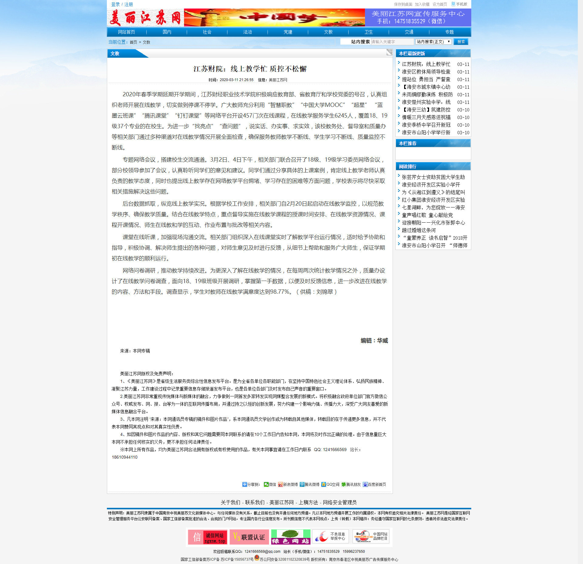 2020年春季学期延期开学期间,江苏财经职业技术学院积极响应教育部、省教育厅和学校党委的号召,认真组织老师开展在线教学,切实做到停课不停学。广大教师充分利用“智慧职教”“中国大学MOOC”“超星” “蓝墨云班课”“腾讯课堂”“钉钉课堂”等网络平台开设457门次在线课程,在线教学服务学生6245人,覆盖18、19级37个专业的在校生。为进一步“找亮点”“查问题”,说实话、办实事、求实效,该校教务处、督导室和质量办等相关部门通过多种渠道对在线教学情况开展全面检查,确保服务教师教学不断线、学生学习不断线、质量监控不断线。
