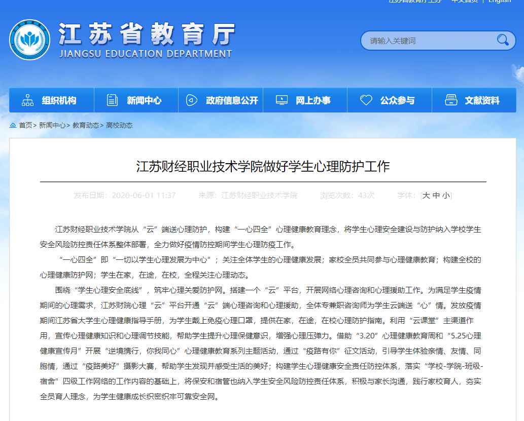 江苏财经职业技术学院从“云”端送心理防护,构建“一心四全”心理健康教育理念,将学生心理安全建设与防护纳入学校学生安全风险防控责任体系整体部署,全力做好疫情防控期间学生心理防疫工作。