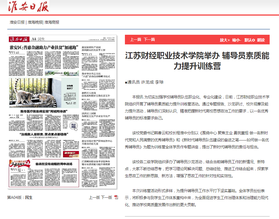 (通讯员 许龙成 李琼)为切实加强学校辅导员队伍职业化、专业化建设,日前,江苏财经职业技术学院组织开展了辅导员素质能力提升训练营活动。通过专题报告、沙龙研讨、校外观摩及能力提升活动,辅导员们深刻认识、精准把握新时代高校思想政治工作的要求,以一名优秀辅导员的标准要求自己。