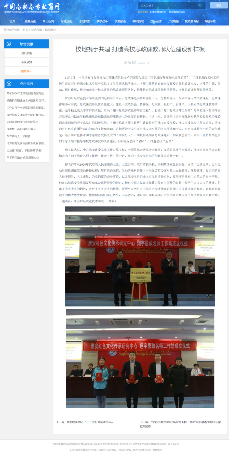 (通讯员:江苏财经职业技术学院 郑毅)11月9日,中共淮安市委党校与江苏财经职业技术学院联合启动“翔宇思政菁英教师培育工程”,“翔宇思政名师工作坊”在江苏财经职业技术学院马克思主义学院正式揭牌成立。名师工作坊旨在充分发挥校内外思政课专家、名师的引领、带动、辐射作用,培养和造就一批高素质的思政课师资队伍,持续推进思政课质量提质培优,实现思政课教师赋能增效。