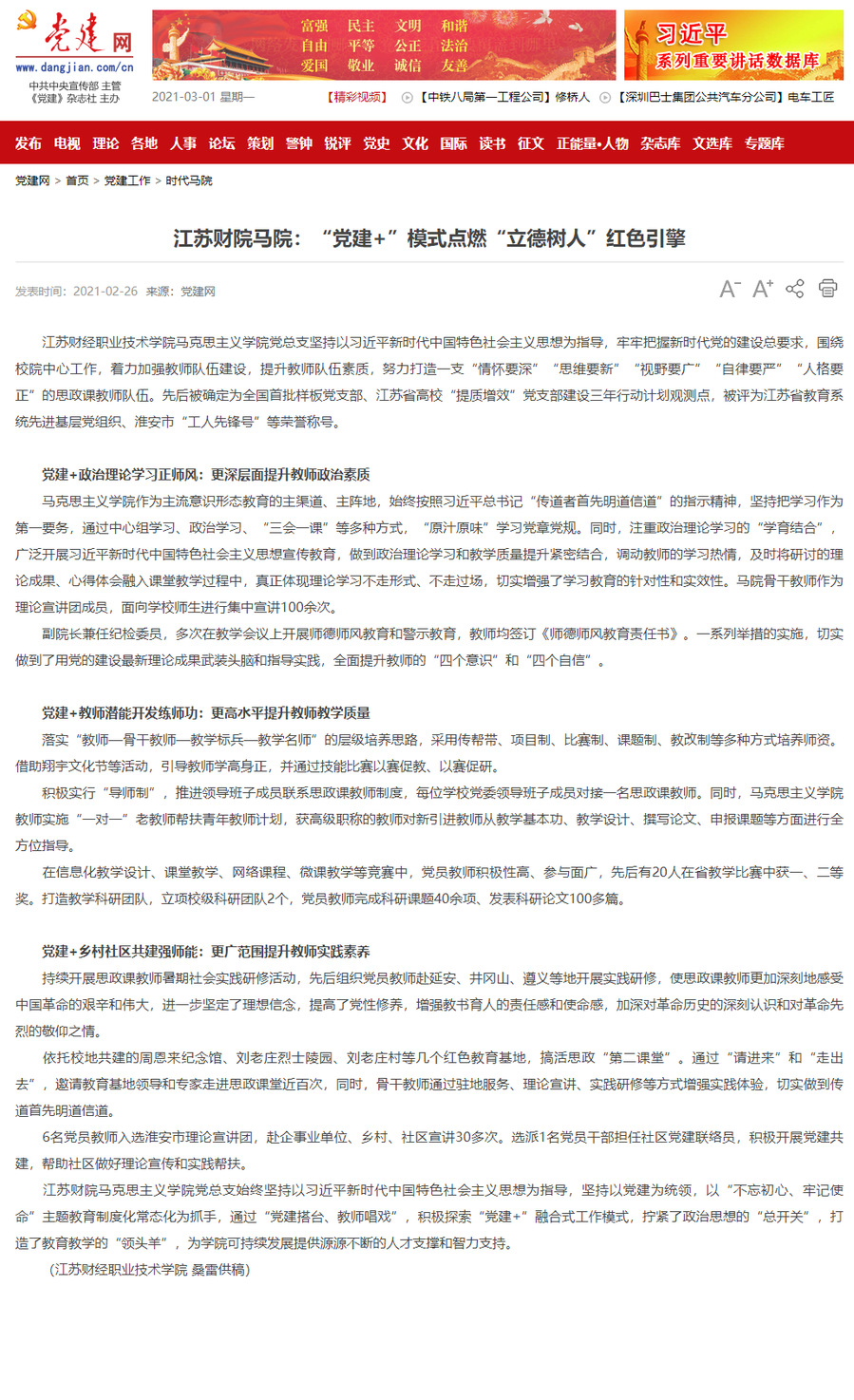 江苏财院马克思主义学院党总支始终坚持以习近平新时代中国特色社会主义思想为指导,坚持以党建为统领,以“不忘初心、牢记使命”主题教育制度化常态化为抓手,通过“党建搭台、教师唱戏”,积极探索“党建+”融合式工作模式,拧紧了政治思想的“总开关”,打造了教育教学的“领头羊”,为学院可持续发展提供源源不断的人才支撑和智力支持。