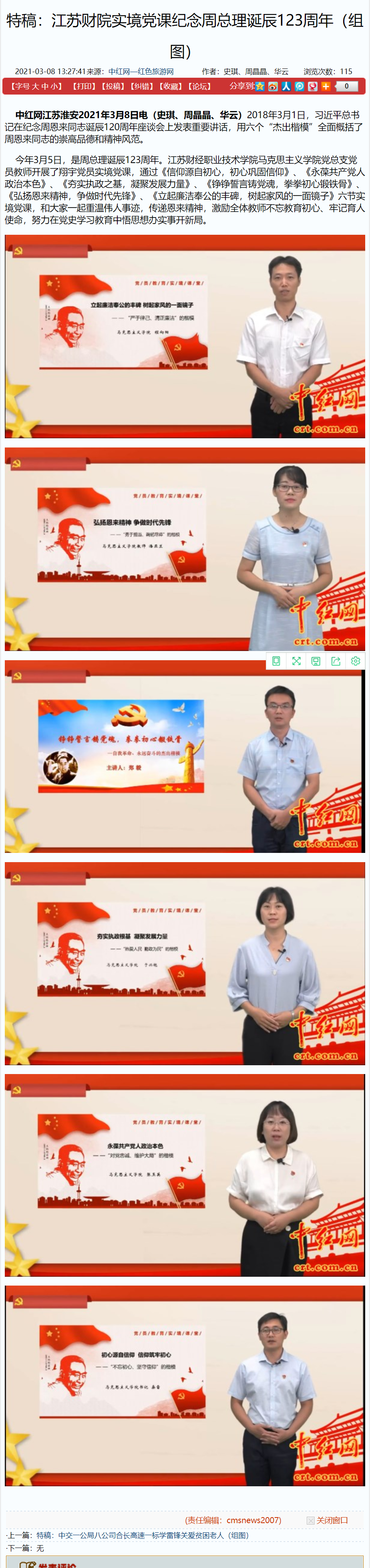 今年3月5日,是周总理诞辰123周年。江苏财经职业技术学院马克思主义学院党总支党员教师开展了翔宇党员实境党课,通过《信仰源自初心,初心巩固信仰》、《永葆共产党人政治本色》、《夯实执政之基,凝聚发展力量》、《铮铮誓言铸党魂,拳拳初心锻铁骨》、《弘扬恩来精神,争做时代先锋》、《立起廉洁奉公的丰碑,树起家风的一面镜子》六节实境党课,和大家一起重温伟人事迹,传递恩来精神,激励全体教师不忘教育初心、牢记育人使命,努力在党史学习教育中悟思想办实事开新局。
