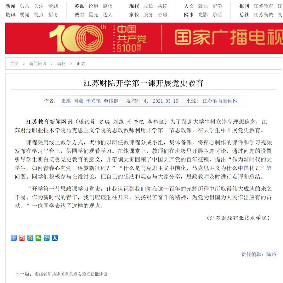 为了帮助大学生树立崇高理想信念,江苏财经职业技术学院马克思主义学院的思政教师利用开学第一节思政课,在大学生中开展党史教育。