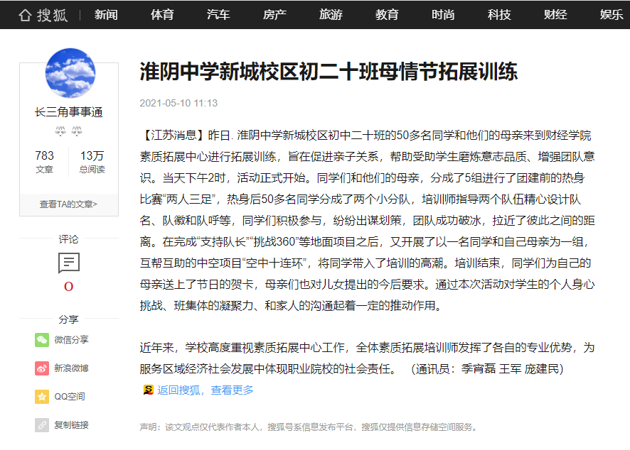 昨日,淮阴中学新城校区初中二十班的50多名同学和他们的母亲来到财经学院素质拓展中心进行拓展训练,旨在促进亲子关系,帮助受助学生磨炼意志品质、增强团队意识。当天下午2时,活动正式开始。同学们和他们的母亲,分成了5组进行了团建前的热身比赛“两人三足”,热身后50多名同学分成了两个小分队,培训师指导两个队伍精心设计队名、队徽和队呼等,同学们积极参与,纷纷出谋划策,团队成功破冰,拉近了彼此之间的距离。在完成“支持队长”“挑战360”等地面项目之后,又开展了以一名同学和自己母亲为一组,互帮互助的中空项目“空中十连环”,将同学带入了培训的高潮。培训结束,同学们为自己的母亲送上了节日的贺卡,母亲们也对儿女提出的今后要求。通过本次活动对学生的个人身心挑战、班集体的凝聚力、和家人的沟通起着一定的推动作用。