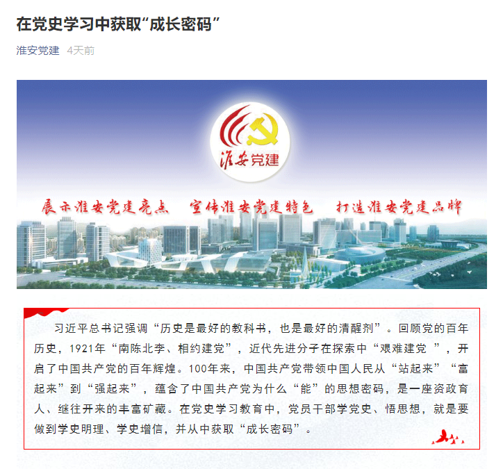 习近平总书记强调“历史是最好的教科书,也是最好的清醒剂”。回顾党的百年历史,1921年“南陈北李、相约建党”,近代先进分子在探索中“艰难建党 ”,开启了中国共产党的百年辉煌。100年来,中国共产党带领中国人民从“站起来”“富起来”到“强起来”,蕴含了中国共产党为什么“能”的思想密码,是一座资政育人、继往开来的丰富矿藏。在党史学习教育中,党员干部学党史、悟思想,就是要做到学史明理、学史增信,并从中获取“成长密码”。