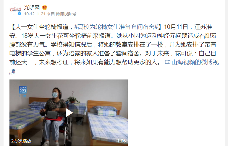 10月11日,江苏淮安。18岁大一女生花可坐轮椅前来报道。她从小因为运动神经元问题造成右腿及腰部没有力气。学校得知情况后,将她的教室安排在了一楼,并为她安排了带有电梯的学生公寓,还为陪读的家人准备了套间宿舍。对于未来,花可说:自己目前还大一,未来想考证,将来如果有能力想帮助更多的人。