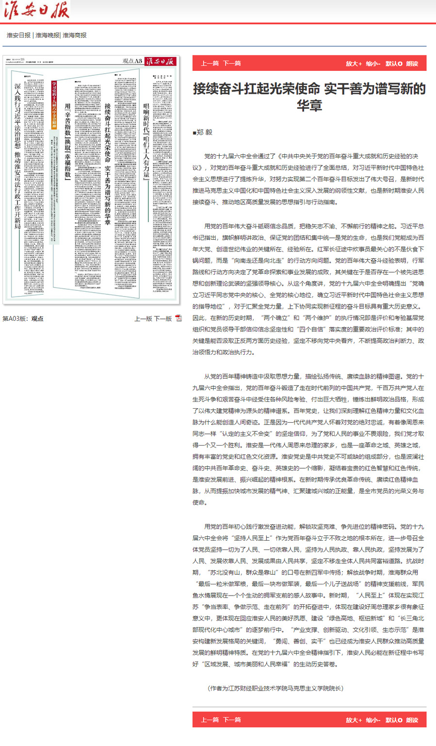 党的十九届六中全会通过了《中共中央关于党的百年奋斗重大成就和历史经验的决议》,对党的百年奋斗重大成就和历史经验进行了全面总结,对习近平新时代中国特色社会主义思想进行了提炼升华,对努力实现第二个百年奋斗目标发出了伟大号召,是新时代推进马克思主义中国化和中国特色社会主义深入发展的纲领性文献,也是新时期淮安人民接续奋斗、推动地区高质量发展的思想指引与行动指南。