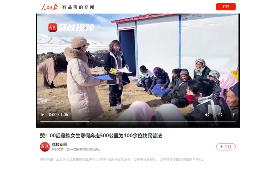 【人民日报】赞!00后藏族女生寒假奔走500公里为100余位牧民普法