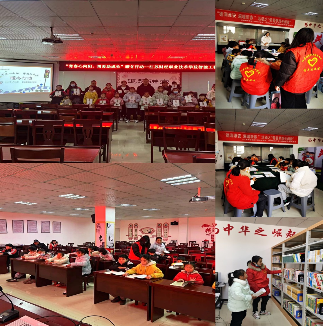 “带着梦想去阅读”。紧接着,在“德润淮安,温暖新春”活动之“带着梦想去阅读”活动中,智能工程技术学院的青年师生为孩子们带来了《中华优秀传统文化》、《十万个为什么》、《七彩语文》等课外读物,指导孩子们学习中华传统文化,协助他们挑选课外读物,鼓励孩子们“带着梦想去阅读”并在许庄村党群服务中心的阅读室开展了背诗歌比赛,引导孩子们展示自我,勇于竞争,培养他们乐观豁达的心态。