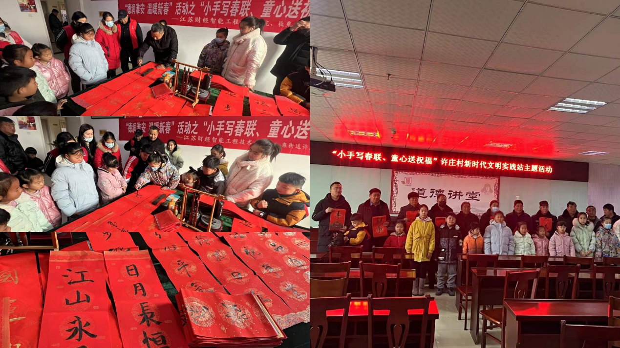 “小手写春联,童心送祝福”。活动开始,枚乘路街道许庄村的文明实践站,二十多名刚放寒假的小学生欢聚在社区党群服务中心,在书法家的指导下小朋友们写起了对联,一幅幅具有浓郁时代气息和美好期盼的春联送到了社区老党员们的手里。随后,江苏财经职业技术学院智能工程学院的青年志愿者向孩子们讲解了春节贴春联的习俗文化,并以讲座的形式向小朋友们普及了法纪安全教育,提醒小朋友们配合防疫工作,增强安全意识,遵守交通规则,不玩火,不碰电,远离危险品,筑牢人身安全防线。