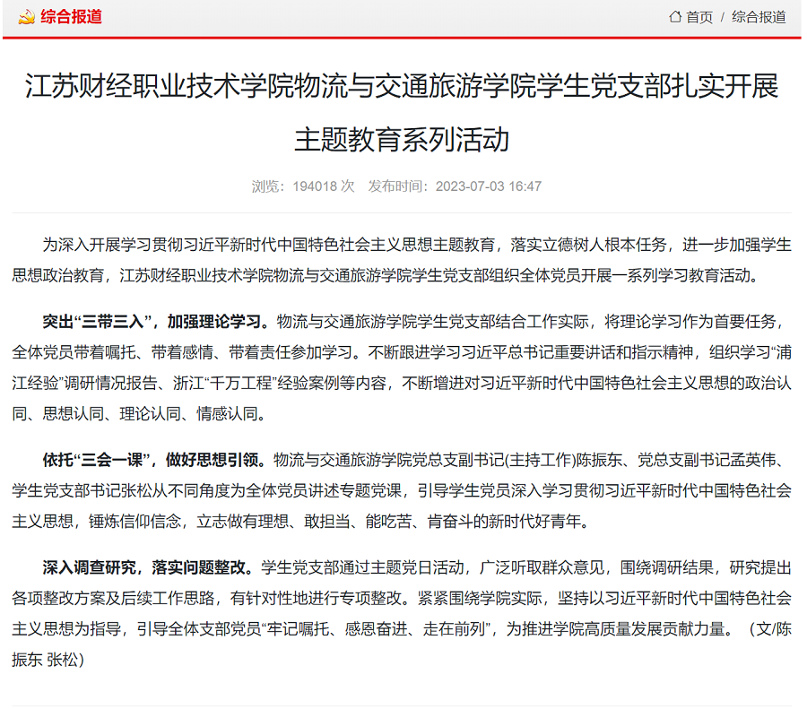 【全国基层党建网】江苏财经职业技术学院物流与交通旅游学院学生党支部扎实开展主题教育系列活动