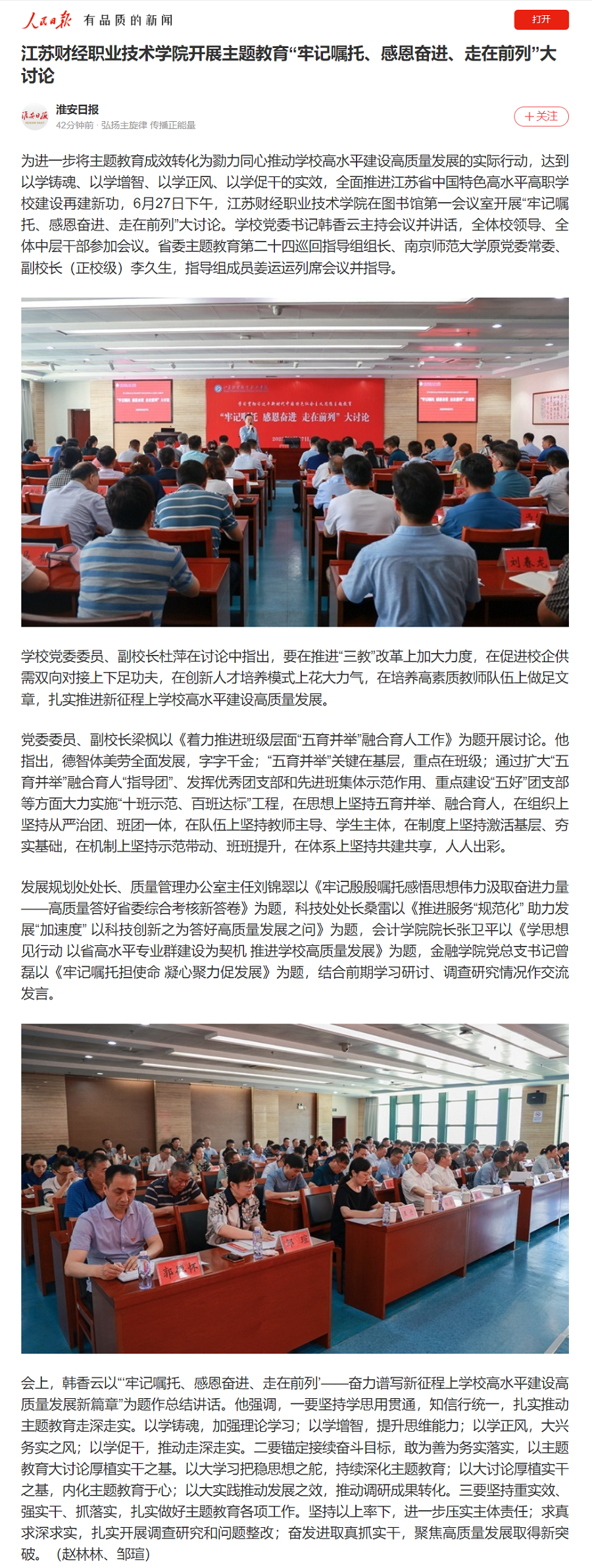【人民日报】江苏财经职业技术学院开展主题教育“牢记嘱托、感恩奋进、走在前列”大讨论