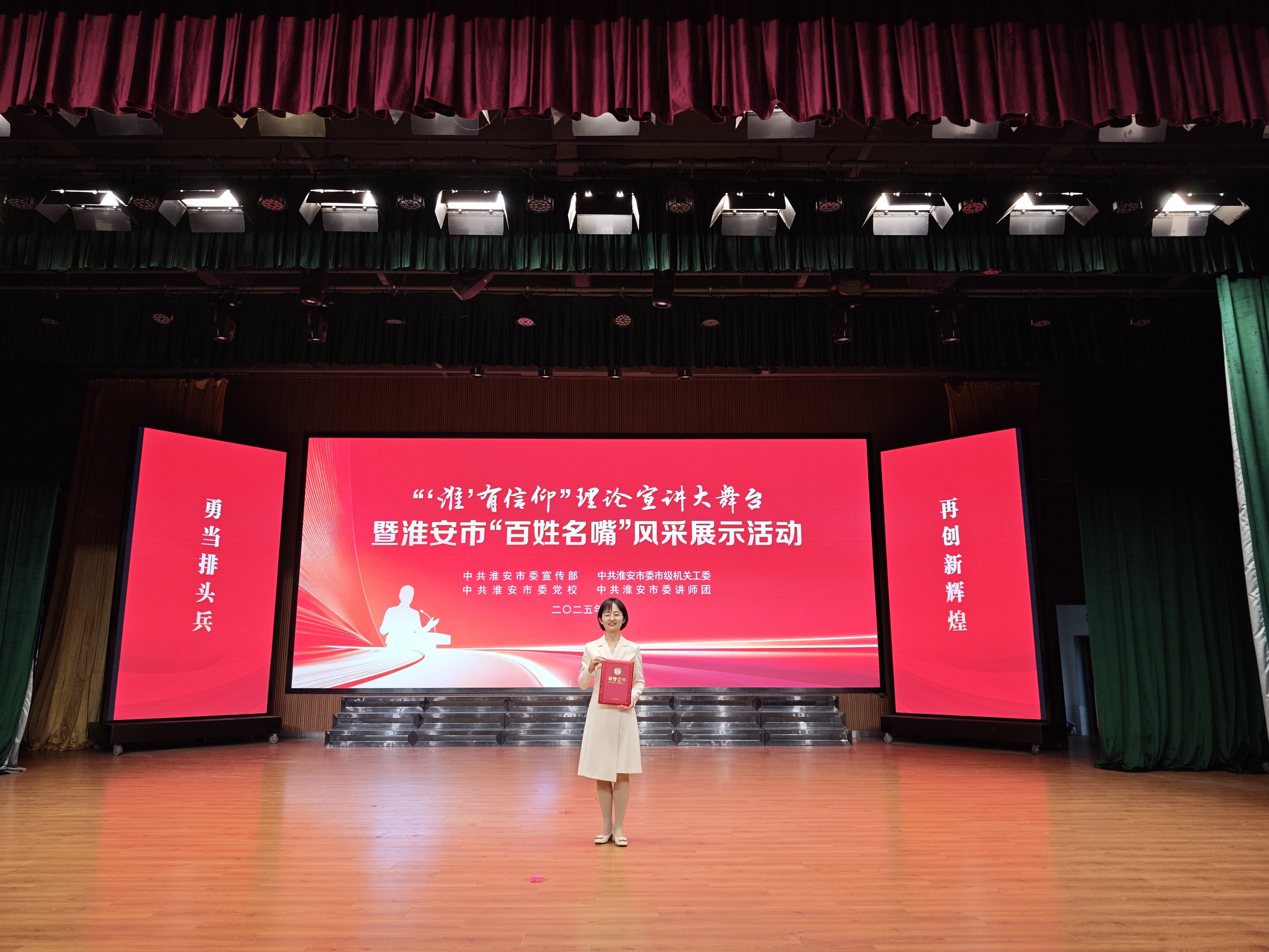 在2025年淮安市“百姓名嘴”风采展示活动决赛中,我校孟文玉老师展现了出色的宣讲风采。其《以青年担当守护文化安全》为题的宣讲,语言生动、情感真挚,将青年理想融入时代使命,以鲜活案例诠释文化安全的深层内涵,赢得了现场评委和观众的热烈掌声,最终摘得二等奖。