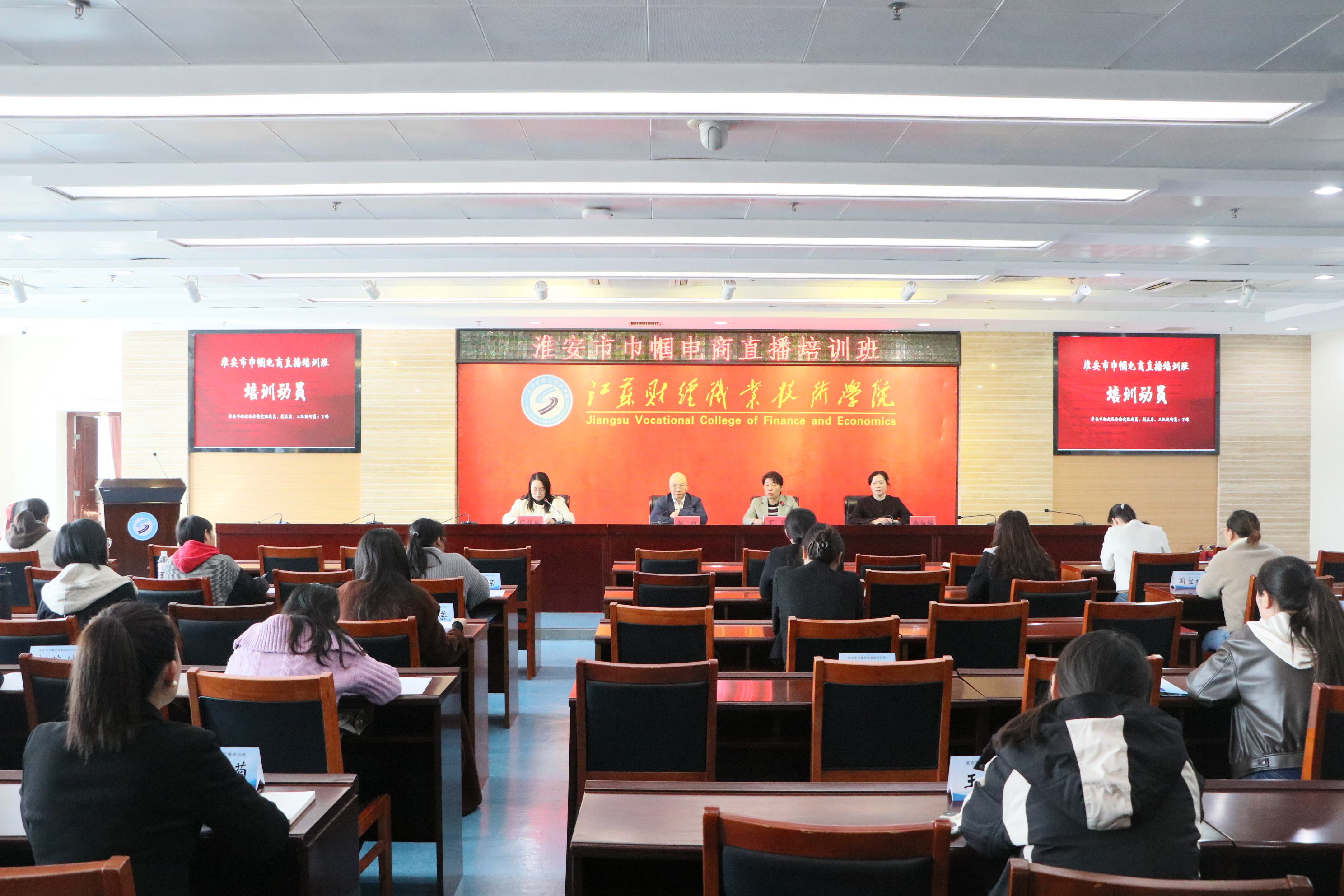 金秋十月,硕果盈枝。10月22日,由淮安市农业农村局、淮安市妇女联合会主办、江苏财经职业技术学院承办的“淮安市巾帼电商直播培训班”,在图书馆第一会议室正式开班。淮安市妇女联合会党组成员、副主席、三级调研员丁伟作培训动员,学校党委副书记、校长张维,淮安市农业农村局科教处处长刘汉松分别作专题报告。来自全市各县区的乡间巾帼主理人、巾帼新农人和女村播等40余名优秀女性代表参加培训。