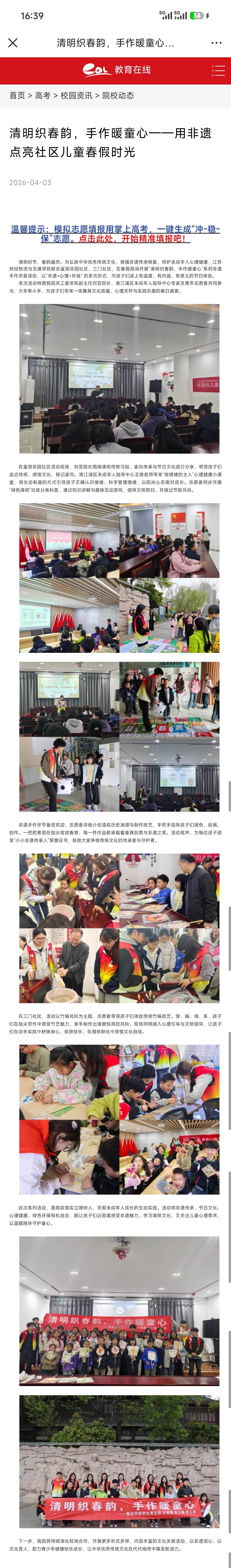 清明时节,春韵盎然。为弘扬中华优秀传统文化,厚植非遗传承根基,呵护未成年人心理健康,物流与交通学院联合富丽花园社区、三门社区,在春假期间开展“清明织春韵,手作暖童心”系列非遗手作关爱活动,以“非遗+心理+环保” 的多元形式,为孩子们送上有温度、有内涵、有意义的节日体验。