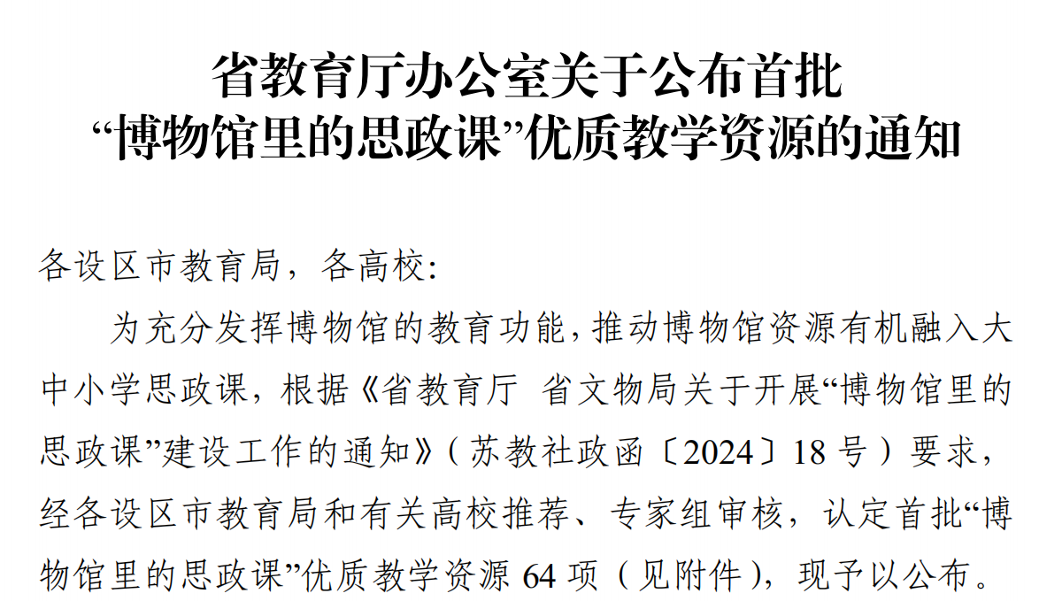 此次入选全省64 项省级优质教学资源(覆盖大学、高中、初中、小学各学段),是学校加强“大思政课”建设、推进馆校协同育人的重要成果。学校将持续深化大中小学思想政治教育一体化建设,充分挖掘地方文化育人价值,不断提升思政育人的针对性与实效性,构建新时代立德树人新格局。