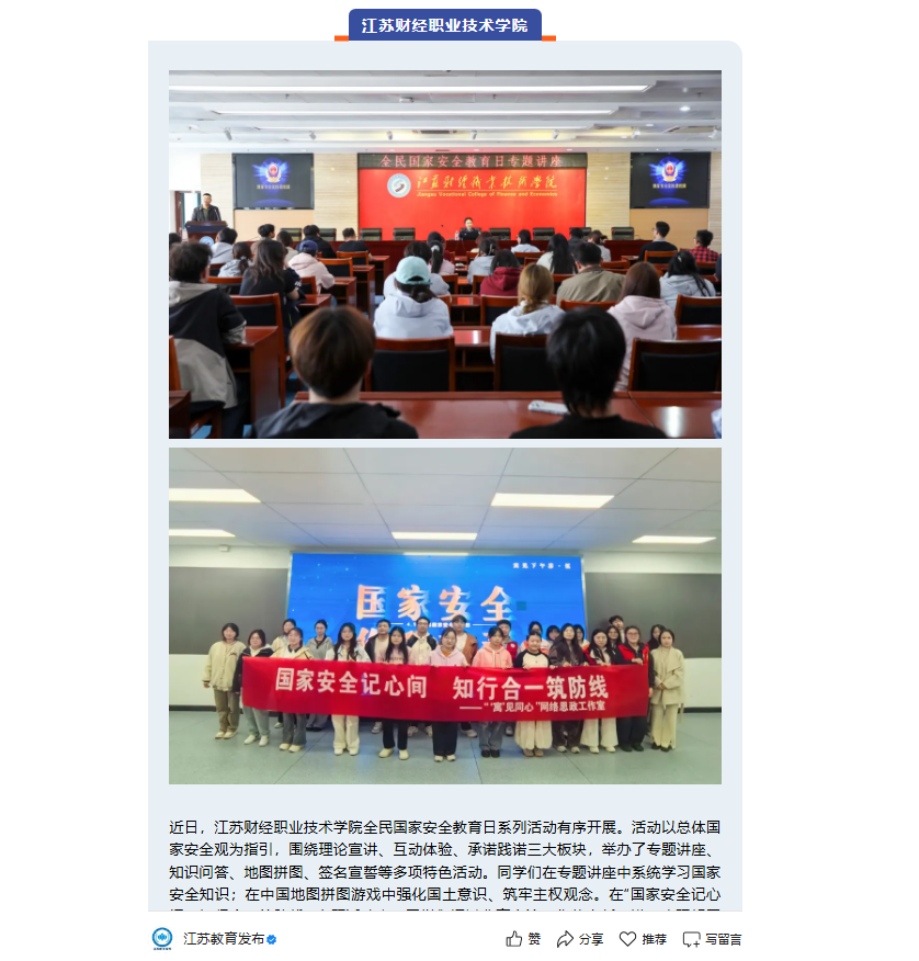 近日,江苏财经职业技术学院全民国家安全教育日系列活动有序开展。活动以总体国家安全观为指引,围绕理论宣讲、互动体验、承诺践诺三大板块,举办了专题讲座、知识问答、地图拼图、签名宣誓等多项特色活动。同学们在专题讲座中系统学习国家安全知识;在中国地图拼图游戏中强化国土意识、筑牢主权观念。在“国家安全记心间,知行合一筑防线” 主题活动中,同学们通过分享交流、集体宣誓,进一步理解国家安全的内涵,树立 “国家安全,人人有责” 的责任意识。(陈诗祺 汪彤彤 葛家玉)