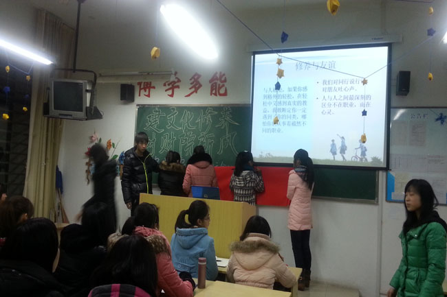 在当晚的活动期间,会计系各班同学积极踊跃地参与到活动中来,使各班级活动各具特色。例如12注税班的班会主题鲜明,PPT新颖。12会计3班组织的知识竞答,同学们积极抢答,活动场面十分热闹。12会计5班组织的精彩辩论赛,辩论对决的方式阐述文化修养对个人对社会对国家的重要性。在众多精彩纷呈的活动中,最富有新意的是12会信班的主题活动,他们模仿江苏卫视著名知识竞答节目“一战到底”。通过一问一答的竞赛形式,充分调动了同学们参与的积极性,也加深了同学们对文化的了解。在这一个又一个精彩的活动中,充分展现了该系大学生积极向上的精神面貌。