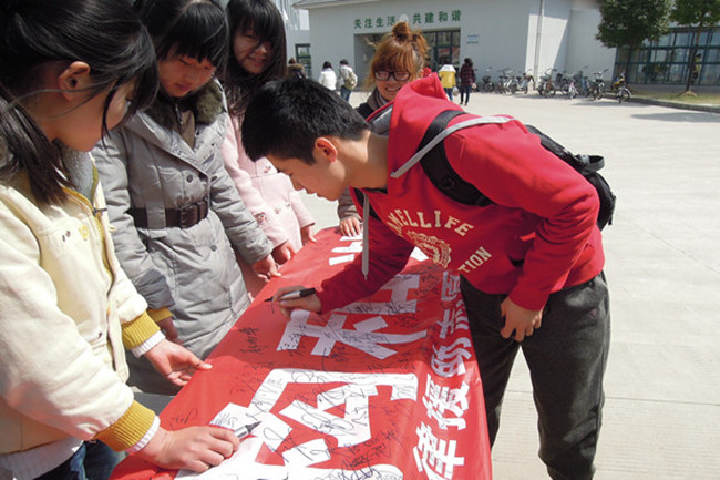 “讲诚信,反欺诈,构和谐。”红色的横幅醒目地出现在校园里,吸引下课的师生们纷纷上前去参与活动。活动期间法律援助志愿者协会的成员还向老师和同学们讲述了消费者维权的相关知识,同时他们还制作了消费维权的宣传单,进行现场发放。