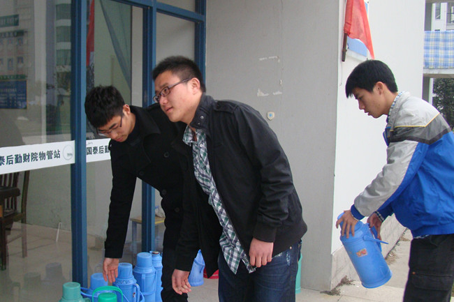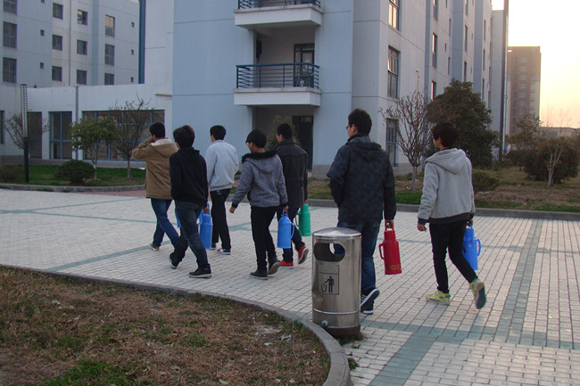 一开始,男生们面对那么多集体围观的女生还有些不好意思,头也不敢抬就拎起三四个水壶往学校水房的方向赶,令女生们忍俊不禁。虽然宿舍楼离水房并不远,但几个水壶的重量加起来也不小,看着男生们卖力的样子,很多女生都拿出手机记录下这温馨的一幕。紧接着,男生们将一壶壶热水送到女生手中,温暖着在场所有女生的心。女生们一致评价道:“经贸系男生个个都是好男儿!”