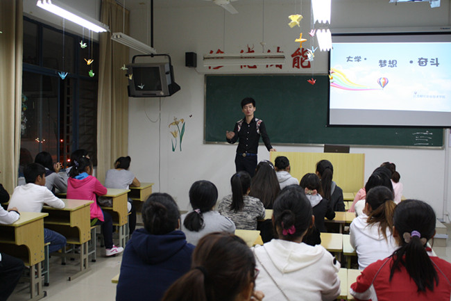早在学院开学典礼结束之后,经济贸易系已经将吴书记讲话内容通过网络和文件形式下发到班级,要求每位同学认真学习,思考。当晚,林森老师采用PPT的形式,图文并茂的向同学们认真解读了吴书记讲话中关于“第一关于大学:我们是一所什么样的学校”、“第二关于梦想:我们有着怎样的未来”和“第三关于奋斗:我们如何走好三年的大学路程”等内容。“精细理财的行家、善于营销的能手、机电制造的巧匠、食品安全的卫士、法律维权的使者、艺术设计的大师”表达了学院对于每位新同学的殷切希望。