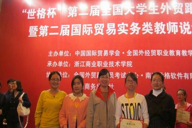 本次大赛是由中国国际贸易学会、全国外经贸职业教育教学指导委员会、中国国际贸易学会国际贸易实务类教学工作委员会主办,全国外贸跟单员考试中心、南京世格软件有限责任公司、中国商务出版社协办,浙江商业职业技术学院承办。由经济贸易系学生贺芳霞和孙红玉、指导老师张丽和李洁组成的我院代表队参加了比赛,获得了高职组团体二等奖、贺芳霞获得个人二等奖。