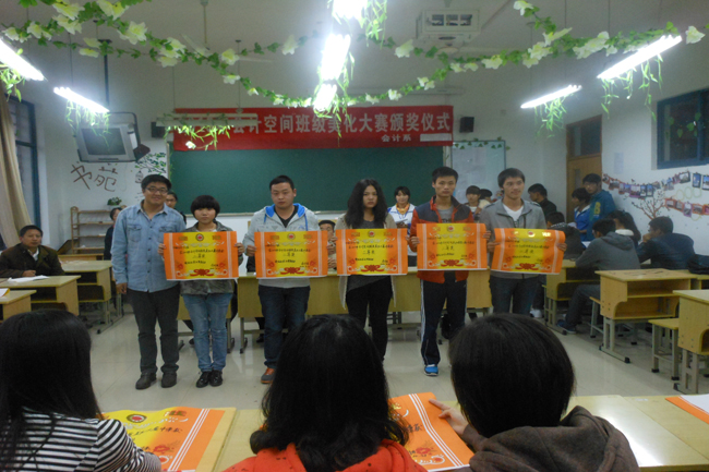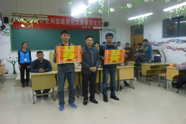 为了营造班级和宿舍积极健康、温馨友善学习氛围,培养学生良好的审美意识和情趣,会计系于10月初——10月底开展了为期三周的教室和宿舍美化大赛。为了使教室和宿舍美化大赛深入人心,10月31日下午,会计系在JC-207召开了“会计空间”教室和“会计人家”宿舍美化大赛颁奖仪式。系党总支书记李建华、副书记罗斌,系团总支书记许龙成,系辅导员张玉英、毛悦、袁飞、周学兵,以及2013级各班代表参加了颁奖仪式。