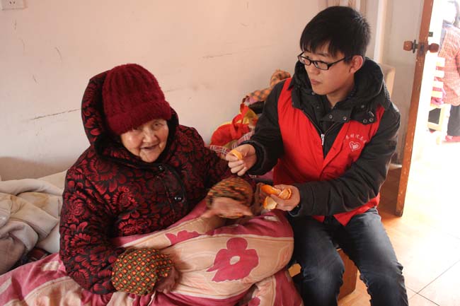 来到敬老院,志愿者们为老人们梳妆打扮,送上了袜子等衣物,同时还陪老人们下象棋,打扑克,打扫房间,整理衣物,陪他们聊天,老人们露出了许久没有的微笑。同时,我系的志愿者们还为老人们带来了精彩的文艺节目,唱歌,跳舞,老人们一边看节目,一边吃我们送来的水果,别提有多开心了,顿时变年轻了许多。弘扬雷锋精神,争做时代先锋,志愿者们用自己的行动与爱心把这个原本孤寂的敬老院顿时显得充满了无数的欢笑与温暖。