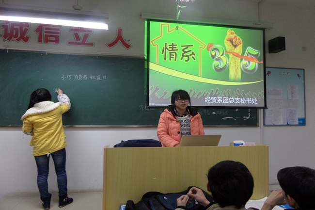 此次活动以“消费与安全”为主题在13级所有班级展开,我系团总支秘书处成员通过ppt的形式,宣传消费维权的基本知识。提醒同学们在消费时要提高自我防范意识、权利意识、文明消费意识和消费者群体保护意识。在看完演讲后,同学们又看了一段新闻视频,一张张打假的照片显示出来时,一双双眼睛都瞪得大大的,现场气氛很活跃。