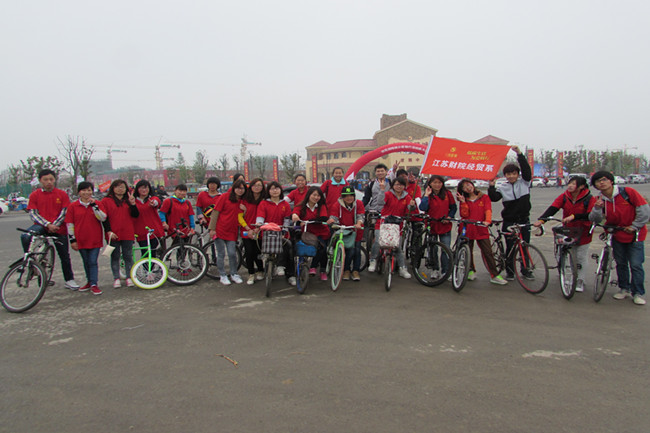 在经过将近一个小时的车程后,我们到达目的地淮安市电视台,这里早已是人山人海,刚进入大门,就看到我系团总支书记林森在此已等候多时并准备了一箱矿泉水以及骑行时穿的爱心志愿服,在等待现场具体安排后,各大爱心集团、公司准备出发。我系同学在林书记帮忙拍过集体照后,两人一排,浩浩荡荡的向钱隆城出发。一路上,我们看到很多团队,他们以多种名义参加骑行活动,传递着他们的爱。在经过一段时间的骑行活动后,同学们个个大汗淋漓,以至于上坡时有些吃力,同学们手搭手,相互帮助,我们相信,坚持就是胜利。