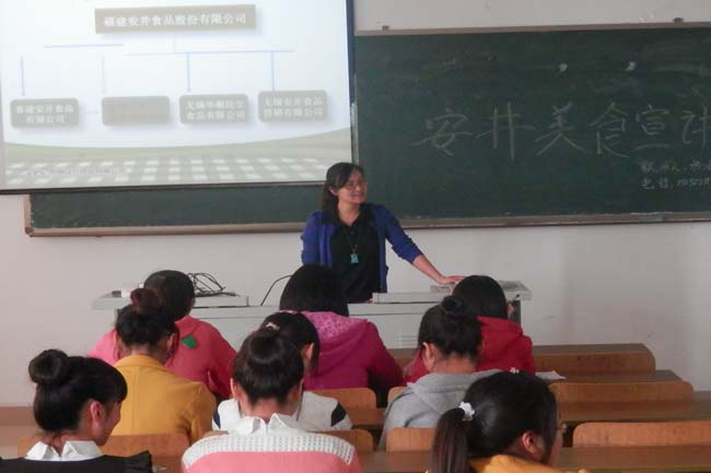 在宣讲会上,杨老师为同学们讲述了安井食品有限公司的历史和发展状况,展示了公司主要销售的产品,介绍了公司员工的要求与待遇的情况。同学们在仔细听取宣讲会的内容,纷纷提出自己的问题,询问在就业招聘时应该注意以及企业对招收员工的要求等问题。杨经理结合自身实际经验,谈了自己在遇到问题时解决的方法,并鼓励同学们大胆创新。