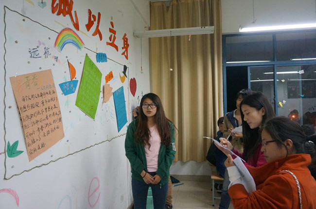 本次活动分两部分开展,先由各班准备关于心理健康黑板报,由各班讲解员对同学们进行讲解,再由各班心理委进行PPT的讲述。活动邀请了三委会主席担任评委。市场营销一班的黑板报讲解员李菁菁向同学们详细的讲解了黑板报的内容,并在讲解最后套用了汪国真的《嫁给幸福》送给各位同学,希望每位同学都能有健康、快乐的生活。PPT讲解员宗含笑首先通过简单的心理测试小游戏加深了同学们对自己的认识,随后向同学们介绍了规划自己梦想的几个步骤,同学们听得认真,在讲解最后进行了斗志澎湃的宣誓环节。