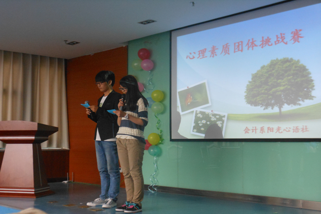 本次挑战赛共分四个部分:团队展示、心理健康知识问答、情景模拟考验和团队合作。团队展示主要展示各参赛团队的风采和才艺;心理健康知识主要展示各参赛团队对心理知识的了解;情景模拟主要展示各团队成员解决问题大学生心理问题的能力;团队合作主要看各团队队员之间的配合和集体精神。在活动中,各参赛团队精诚团结,各显神通,充分展现出了自己团队的实力和精神面貌,赢得了大家热烈掌声。经过激烈角逐和评委们认真评选,6支参赛团队脱颖而出,分别是13会计11班、13会计7班、13注会5班、13财管2班、13会计14班和13会计16班。