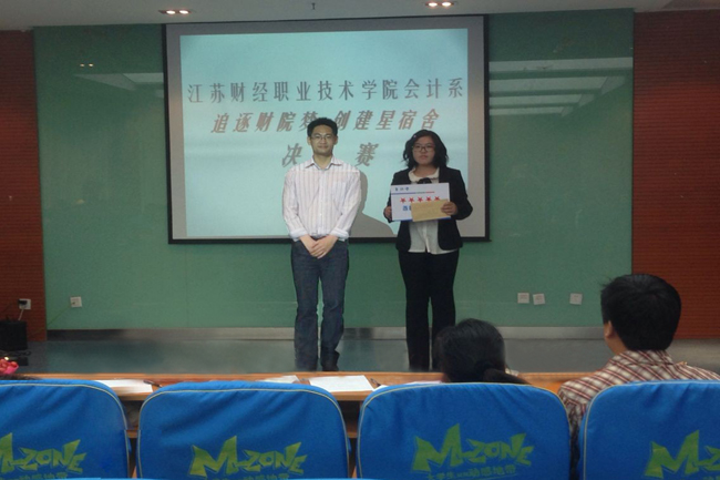5月14日下午在学院图书馆200人报告厅,会计系举行了“追逐财院梦 创建星宿舍”评比暨舍标大赛。系党总支书记李建华、副书记罗斌、系团总支书记许龙成,学院学生处宿管科科长唐翔、老师周峰,学生公寓物业管理公司经理杜宏枫,系辅导员、班主任,以及参赛宿舍和学生代表参加了大赛活动。大赛分为激情演说和才艺展示两部分。