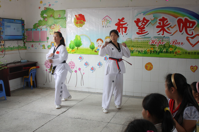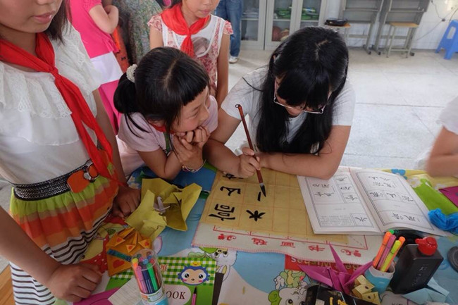 在这值得庆贺的时刻,学院的社团志愿者们为大家带来了独具特色的演出,鬼步舞、国标舞、跆拳道、双截棍、合唱等精彩纷呈的节目赢得了孩子们的阵阵掌声。为了表示对志愿者哥哥姐姐们的感谢,留守儿童们也带来了自己的节目,用朴实无华的演出和自然的真情流露向大家表达了感激之情。演出结束后,志愿者们很快与孩子们打成一片,在室内,志愿者们带着孩子剪纸贴画、弹琴唱歌;在室外,志愿者们带领孩子学习刚刚展示的一些绝活,孩子们尽情投入,天真的笑声,停留在空中,给冉冉的夏日带来一丝凉意。