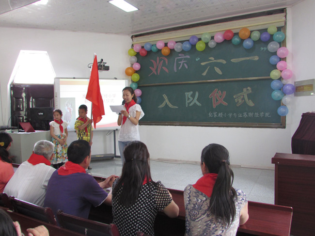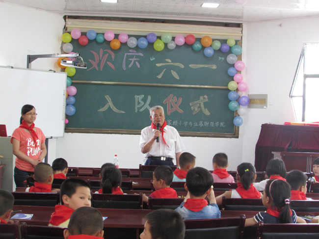 红领巾在胸前迎风飘扬,微笑在脸上尽情的绽放,在这阳光明媚,鸟语花香的初夏季节,孩子们又将迎来了属于他们最喜庆的日子------“六一儿童节”。5月29日下午,我院关工委书记刘宏盛、经济贸易系辅导员于慧婷和系外联部、心理部所有成员来到纪家楼小学参加一年级学生“六一”入队仪式。纪家楼小学党委书记杨书记,大队辅导员汤主任以及各班班主任和一年级全体学生在八角楼参加了此次的活动。