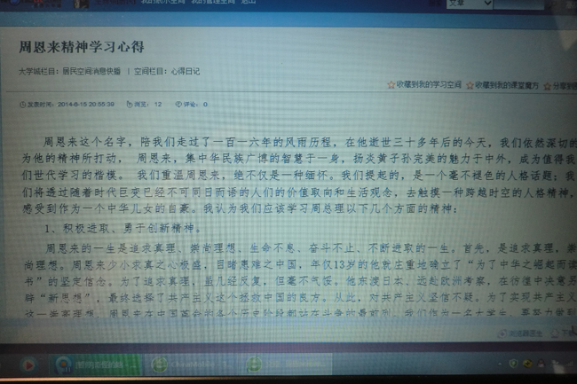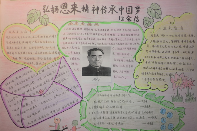 在创建周恩来班活动中,会计系团总支充分利用班级、宿舍、大学城空间,以手抄报和空间日志等形式,将恩来精神“输入”板报,“输进”学生的内心,使恩来精神深入人心。与此同时,各班级还利用网络通道,充分利用新媒体,让同学们以“空间日志”作为载体,用平铺直叙的文字讲述着自己或身边的恩来故事;用温馨阳光的词语激励着自己与伙伴前行。