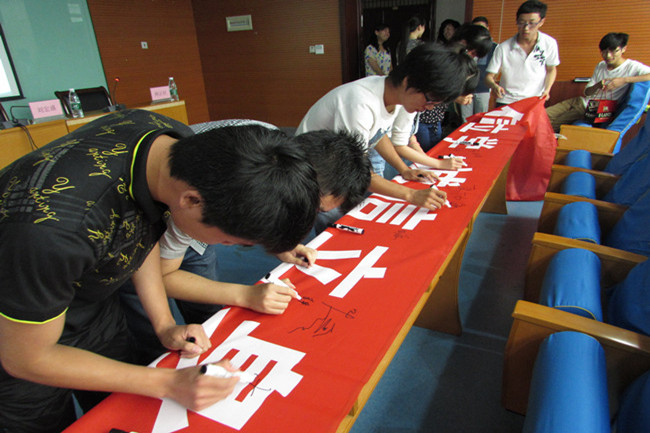 “在这即将考试的时候,我们必须认真面对考试,本着诚实守信的态度来检验自己……”刘主任热情洋溢的讲话为启动仪式拉开了序幕。随后,由学生代表曹金凡宣读诚信考试倡议书。接下来,顾书记又对我系学风建设主要提出以下三点要求:一是统一思想,提供认识;二是加强校园文化内涵建设,营造良好的育人氛围;三是对日常事务认真负责,做好学风建设。“作为一名光荣的大学生,我庄严宣誓……”在学生代表马培根的领读下,整个活动现场气氛庄重严肃,充分体现同学们对诚信考试践行的决心。最后,所有同学在横幅上签名并留影纪念。