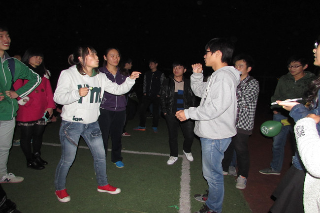 在活动前,学生会心理部在形式上积极探索,大胆创新,设计出了几个各具特色的活动项目 ,如全体合唱“单身情歌”,“心有灵犀-指手画脚”,“情歌接龙”和“爱心小纸条”等。活动一开始,合唱情歌环节就将现场气氛推向了高潮,高昂的歌声环绕在夜空,同学们相互嬉闹,笑声不断。还有许多同学参加了“心有灵犀—指手画脚”,活动随机抽取几对男女配对,并抽签排序,两分钟内,主持人给女生看题板,女生在空白纸上画出所看到的内容,由男生猜,猜到最多的男女可以指任意一对男女真心话大冒险。活动期间,同学们乐在其中,兴致不减。活动过程中各部骨干成员核实流程细节,各位同学积极参加,场内气氛高涨。一系列精彩又有趣的游戏引来了连续不断的尖叫和掌声。最后,同学们围成一个圈进行才艺表演,“小情歌”、“小苹果”、“说笑话”……精彩的节目博得了阵阵掌声。同学们互相留下了联系方式,在欢声笑语中度过了“光棍节”前夜。