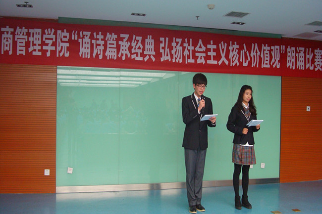 为弘扬社会主义核心价值观、提高学生思想道德素质,11月25日晚上,工商管理学院在图书馆学术报告厅举行了“诵诗篇承经典,社会主义核心价值观”为主题的朗诵比赛活动。工管学院六个新生班级共派出12个队伍参加比赛,学院辅导员叶惠娟、徐静老师以及学生会主席吴相玉、副主席丁文文担任此次比赛评委。