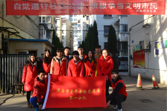 为鼓励青年学生走出校园、深入基层、以自身的实际行动践行社会主义核心价值观,12月6日,我院团总支全体学生干部开展了社会微公益活动,走进淮安市清浦区敬老院,看望敬老院中的老人。 活动当天下午,参加公益活动的学生从学校出发前往敬老院。在敬老院中,同学们与老人进行了亲密的交流,陪伴老人度过了轻松愉快的下午时光。同学们为老人精心准备的节目,得到了老人们的一致肯定。两个多小时转瞬即逝,同学们意犹未尽,但因时间关系只得与老人们告别。 此次活动引导学生以大学生视角关心和帮助社会弱势群体,体现了我院学子为践行社会主义核心价值观所做出的努力。弘扬社会主义核心价值观需要你我共同努力,希望今后有更多的同学们投身公益活动中来,展现新时代大学生良好的精神风貌,为社会做出自己的贡献。(周梦洁 王珏) 志愿者们与老人亲切谈话  淮安市普法志愿者第一分队合影留念