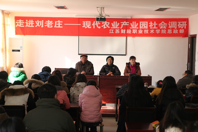 调研座谈在刘老庄村村委会会议室进行,由思政部副主任邹瑄主持。村党总支书记朱林和原村党总支金书记分别对刘老庄村的昨天、今天、明天进行了介绍。金书记对刘老庄村作为江苏省经济薄弱村的昨天进行了历史性回顾,对刘老庄村的四大变化进行总结,以村支“两委”为村民办理的实事、村支“两委”的“1+3”工程以及刘老庄村“六学”高潮为例,阐述今天变化的深刻根源,并为刘老庄村规划了未来建设“全国文明村”、“全国生态村”的美好前景,把刘老庄村建成受人尊敬、令人向往的光荣之地、美丽之地、富庶之地。朱林书记简短回顾了自己从千万富翁成为农村带头人的历程,并现场为参加调研的师生展示了刘老庄村生产基地引进的美国最新农产品宝塔菜,号召青年学生感恩父母、感恩老师、感恩同学、感恩家乡,并用自己的行动回馈家乡。